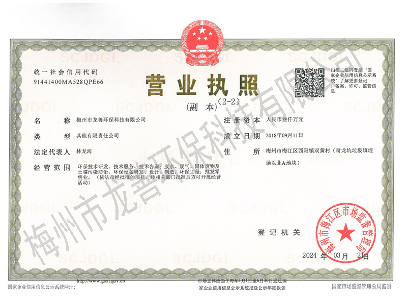 梅州市龍善環保科技有限公司為龍善環保股份有限公司(簡稱“龍善環?!保┳庸?。龍善環保于1995年12月成立,注冊資本為人民幣6,000萬元,總部位于深圳市南山區月亮灣大道2078號兆龍大樓16層。公司經生態環境部、廣東省生態環境廳、深圳市生態環境局、深圳市交通運輸委員會、深圳海事局等部門許可專業從事陸地和海洋環境保護產業的高科技民營企業,主要經營業務包括工業廢物收運、資源化利用和無害化處理處置、海洋船舶污油水接收和集中處理處置、突發環境事故清污應急處置等......